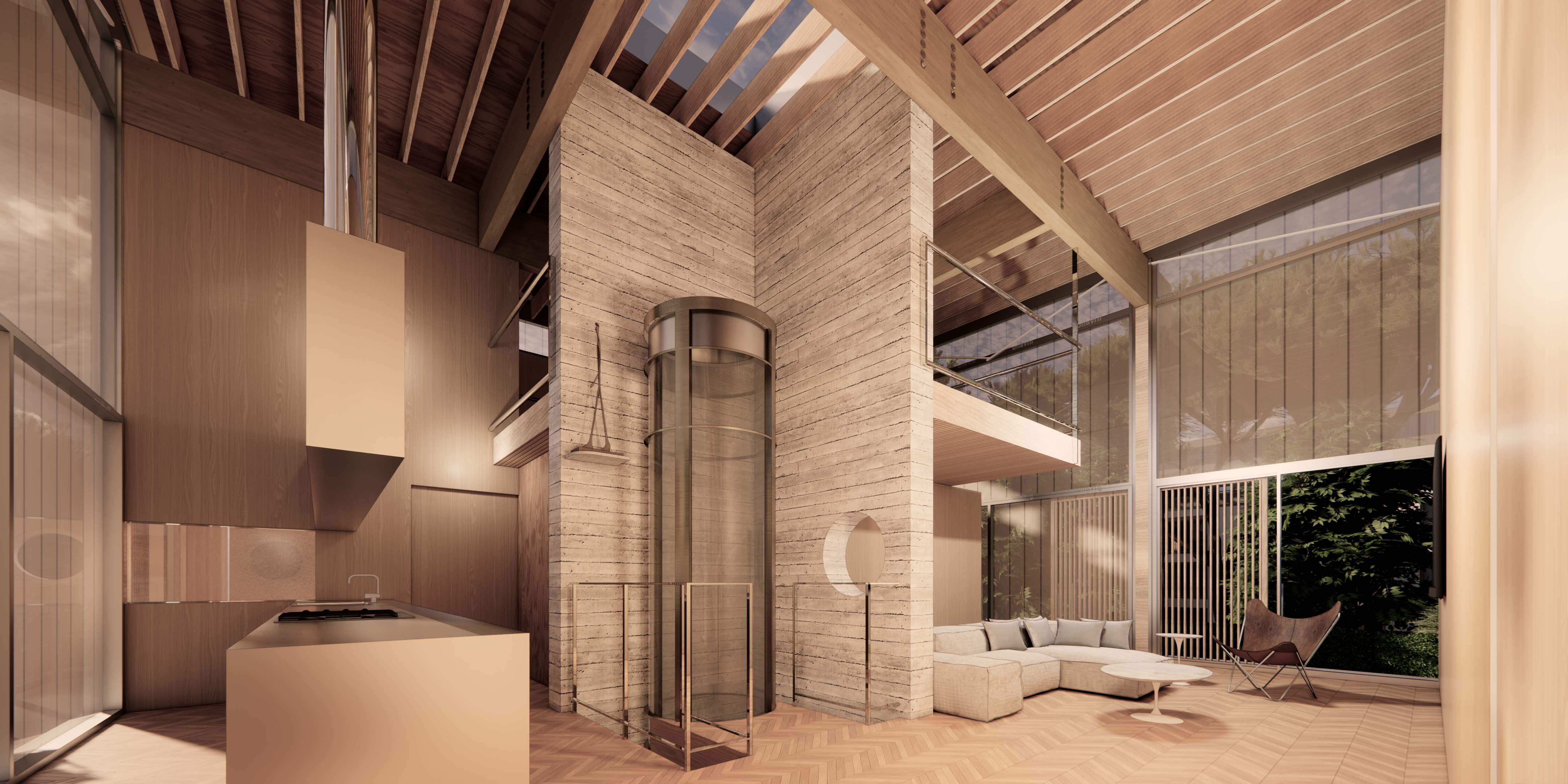 The house has an open plan configuration and the structural system is expressed inside and out. Glulam beams,